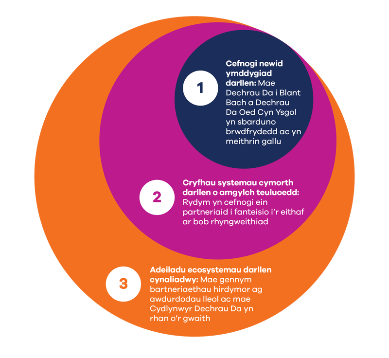 Dyluniwyd Dechrau Da i Blant Bach a Dechrau Da Oed Cyn Ysgol mewn cydweithrediad â phartneriaid a theuluoedd. Maent yn adeiladu ar gryfderau ac yn mynd i’r afael â’r heriau y mae teuluoedd, partneriaid a chymunedau yn eu hwynebu. Mae’r diagram isod yn dangos tair elfen graidd ein rhaglen Dechrau Da i Blant Bach a Dechrau Da Cyn Oed Ysgol: