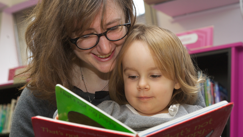 A little girl and her mum reading in a library
